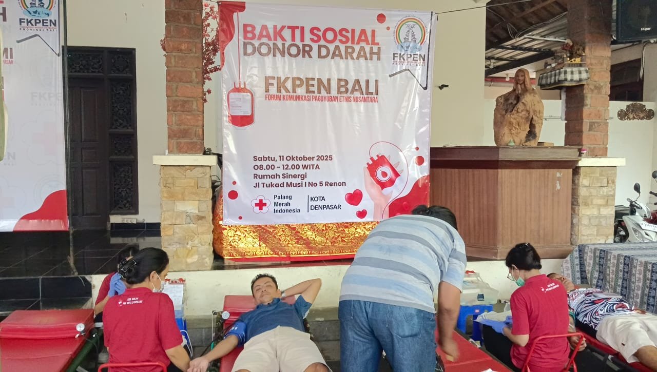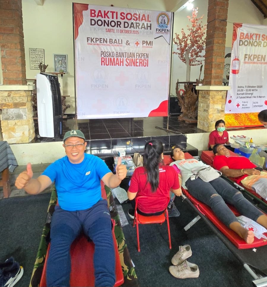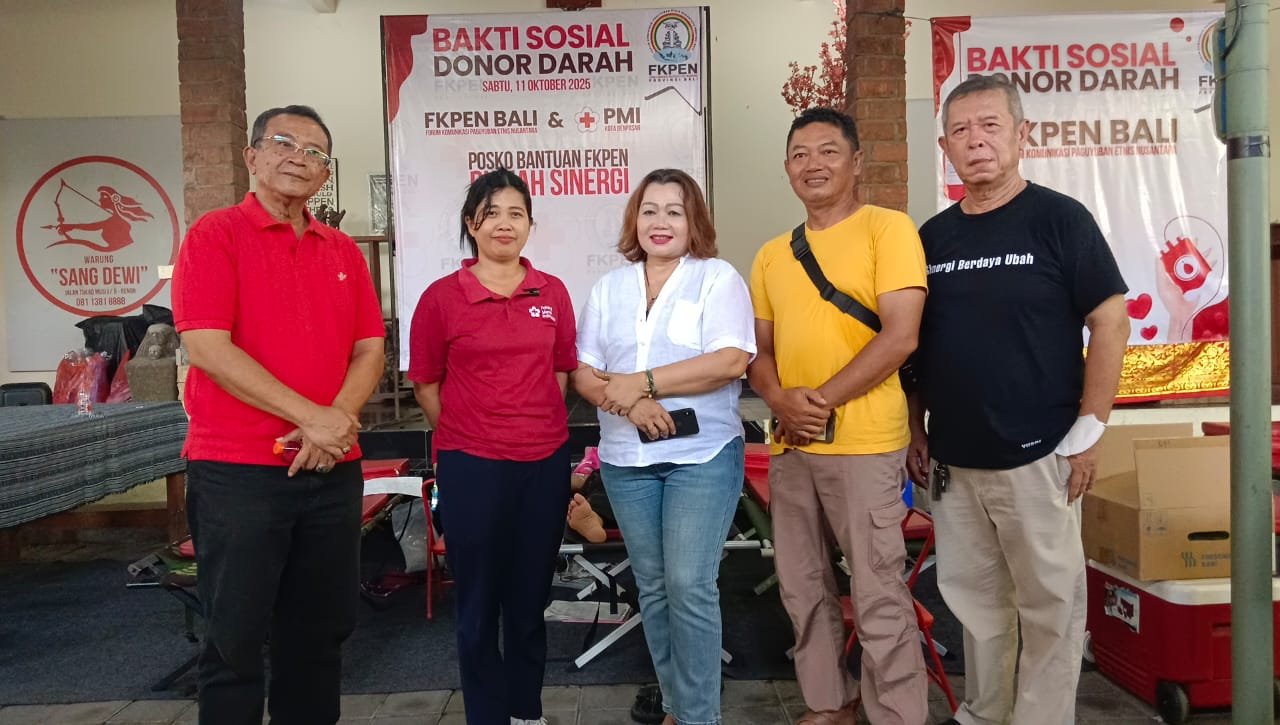 DENPASAR – Dunianewsbali.com, Pasca-banjir yang melanda Kota Denpasar pada 9–10 September 2025 lalu, berbagai pihak terus menunjukkan kepeduliannya terhadap dampak yang ditimbulkan. Salah satunya datang dari Forum Komunikasi Paguyuban Etnis Nusantara (FKPEN) Bali, yang menggelar Bakti Sosial Donor Darah di Posko Bantuan FKPEN Rumah Sinergi, Jalan Tukad Musi I Nomor 5 Renon, Denpasar, Sabtu (11/10/2025).