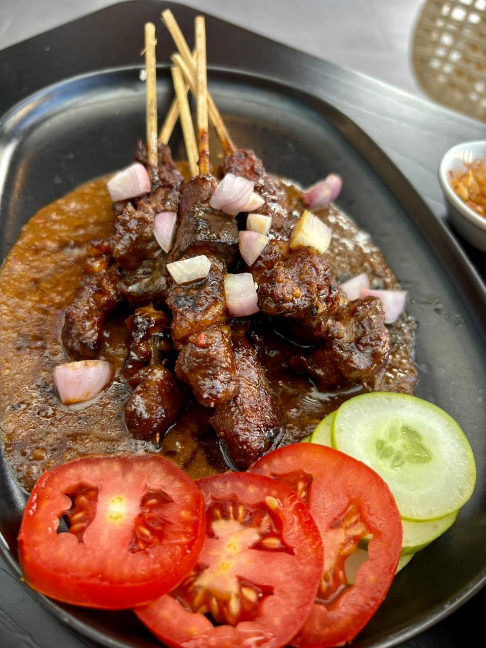 Pada sajian Sate Kambing, teknik pemanggangan modern menjadi pembeda utama. Berbeda dengan metode tradisional yang kerap menghasilkan daging kering atau gosong berlebih, proses ini memastikan kematangan yang konsisten dan tampilan yang lebih bersih. Sate Kambing disajikan lengkap dengan sambal khas, kecap manis premium, irisan timun dan tomat segar, serta pilihan nasi atau lontong sebagai pendamping.