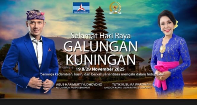 DENPASAR – Dunianewsbalicom, Ketua Umum DPD DPP Partai Demokrat Agus Harimurti Yudhoyono (AHY) bersama Anggota Komisi IX DRP RI Fraksi Demokrat Tutik Kusuma Wardani mengucapkan, “Rahajeng Galungan 19 November, dan Kuningan 29 November 2025. Jadikan kemenangan Dharma atas Adharma”.